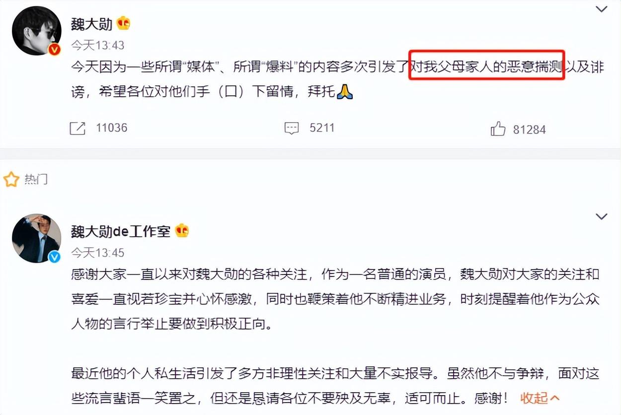而且感情是两个人之间的事,媒体也不应该将魏大勋的父母牵扯进来,话里话外的意思是因为父母催婚,想早点抱孙子,魏大勋才着急求婚。这话更是让人火大,魏大勋家是做生意的,家产早已过亿,魏大勋自己在娱乐圈打拼多年,身家也很丰厚,加上他长得不差,个子也高,根本不愁找不到老婆,怎么会沦落到为了让父母抱孩子才想结婚呢?