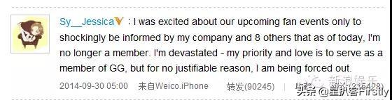 2014年9月底,Jessica突然通过自己的个人微博宣布自己被退团。所发表的博文中特别提到自己是被公司和其他8名成员同时告知的。
