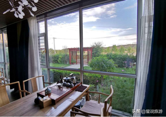 2.新中式风格的装修,免漆老榆木家具古香古色。客栈远离公路,极具田园气息。