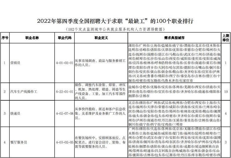 “最缺工”100个职业排行(全国最缺工的一百个职业)